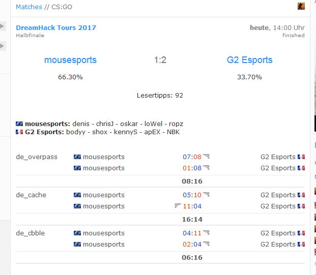 schade, dass die finals morgen so unglücklich von de uhrzeit liegen, hätte ich gerne live geguckt. Freut mich, dass grd ropz gegen navi auch ne gute Leistung gebracht hat und seine erste LAN mit mouz keine katastrophe ist!