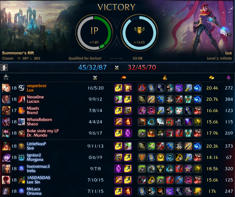 Lux auch erste Sahne zum den Müll in Gold zu carrien. Das Game hätte nach 20min vorbei sein können, aber mein Team wollte ums verrecken nicht groupen und gewinnen, lieber 1by1 reinfeeden obwohl die Gegner sogar Mitte gegrouped haben (weiß gott warum) :D