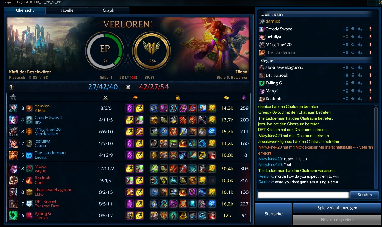 Fizz hat immer verzweifelt versucht mitte zu richten konnte zed halt killed stand am ende 4/4/2. Ich habe versucht thresh/ezreal zu poken war immer safe, hab mitte geroamt als lucian tot war und ihn sogar mit riven auf 30% hp gebracht, flash gezogen, mitte gepinkt... hat alles nix gebracht durfte das game mit 2/1/2 beenden und konnte schön über meine tollen mates lachen, auch weil sie nach 10 minuten aufgegeben haben