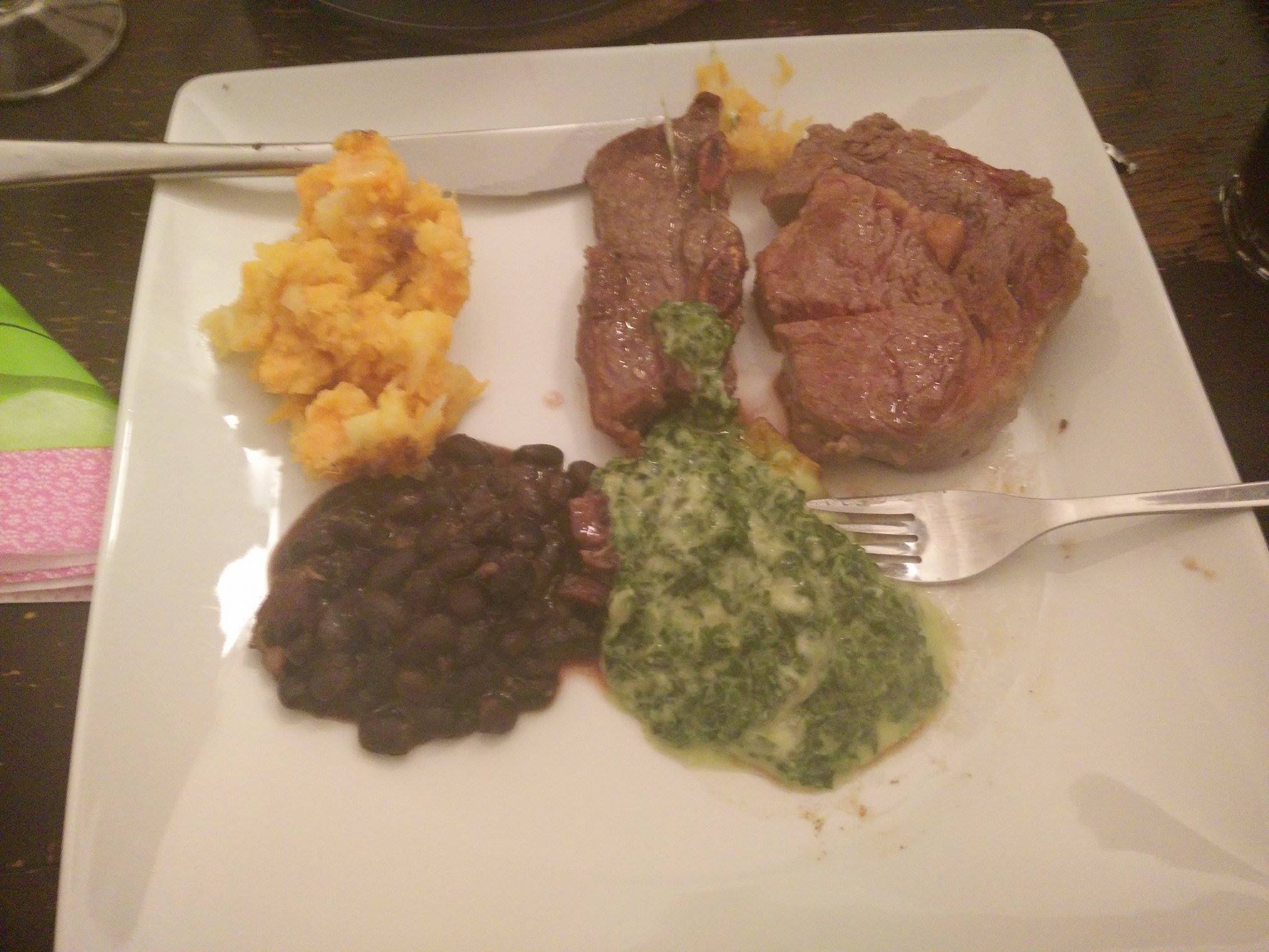 Vorm Steak sind Zwiebeln, genau. Die Bratkartoffeln gab's auch dazu aber die hab ich nicht mehr geschafft.