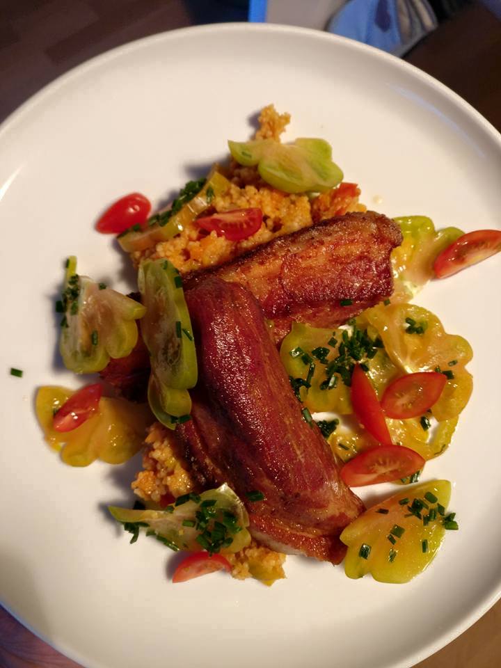 Sous vide gagaarter Schweinebauch mit Cous Cous und Tomaten