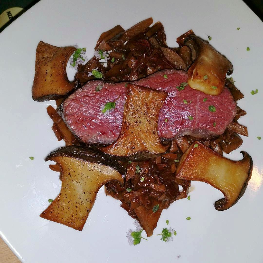 100 Tage gereiftes Entrecote mit Pilzen und Kartoffeln.