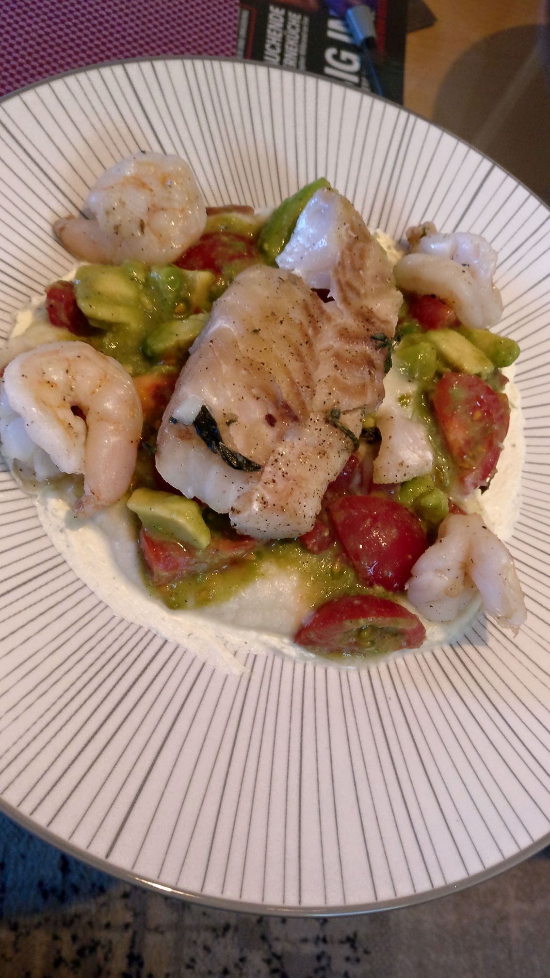 Kabeljau mit Garnelen, Blumenkohl und Tomaten-Avocado Salat.