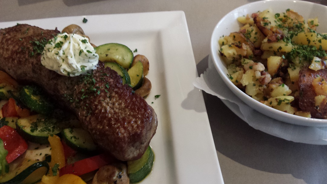 Heute mit Family essen gewesen. Rumpsteak war echt lecker. Bratkartoffeln, weil keine Lust auf Folienkartoffel... Über die Kräuterbutter lässt sich natürlich streiten.
