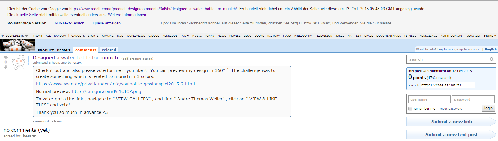 Er so vor 5 Tagen auf reddit (gibt auch noch einen zweiten Thread dort):Nach dem ich bis heute morgen in Führung lag, fand ich es nicht für nötig in einem anderen Forum zu werben. Nur da meine Kontrahentin genau dasselbe macht, dachte ich muss ich zurück schießen.